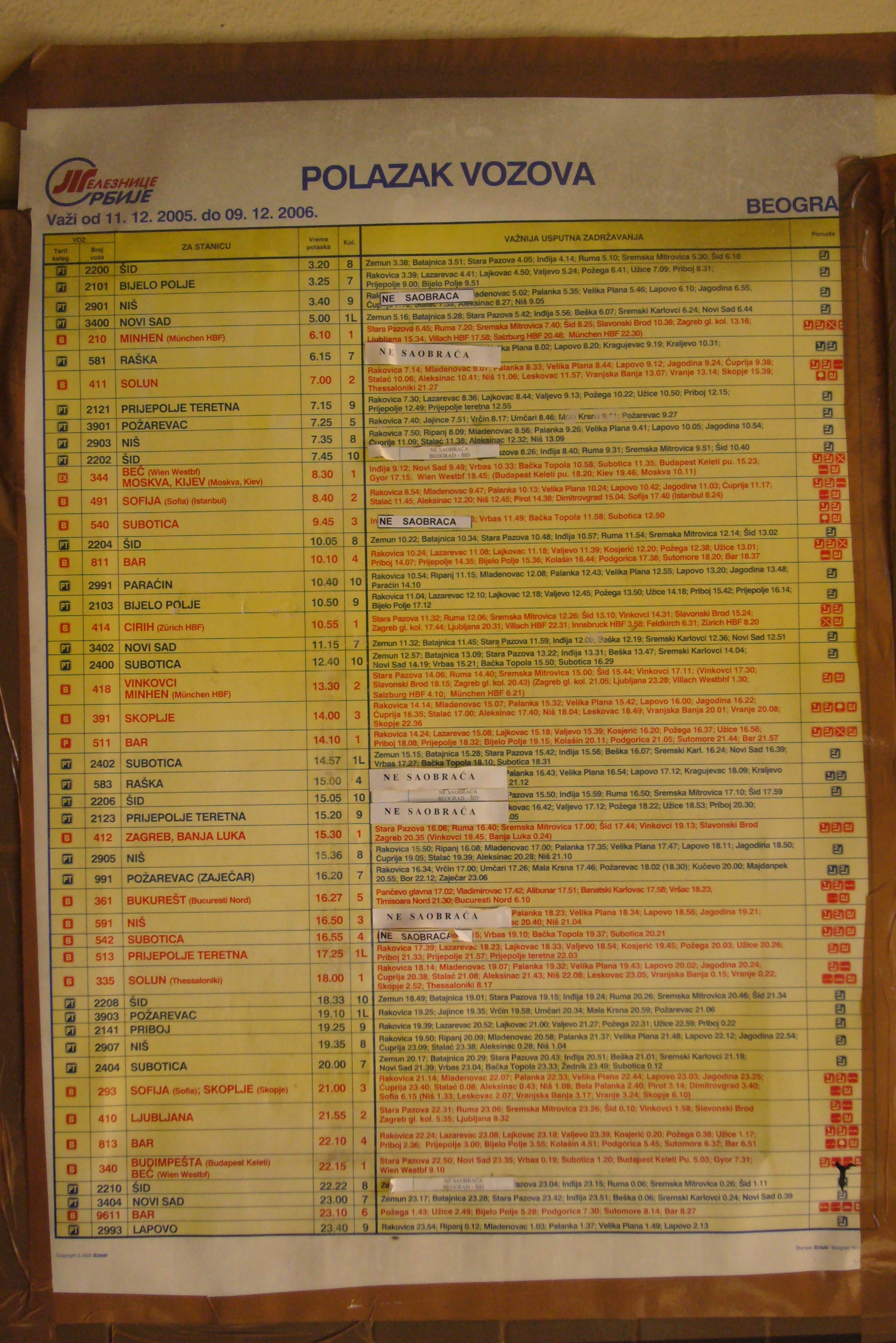 This photo of the Belgrade departures timetable was taken in autumn 2006, but the Belgrade to Bar schedule hadn't changed much since my earlier visit. By this time Serbia and Montenegro had definitively separated, and the Belgrade to Bar route had become an international journey, complete with border checkpoints.